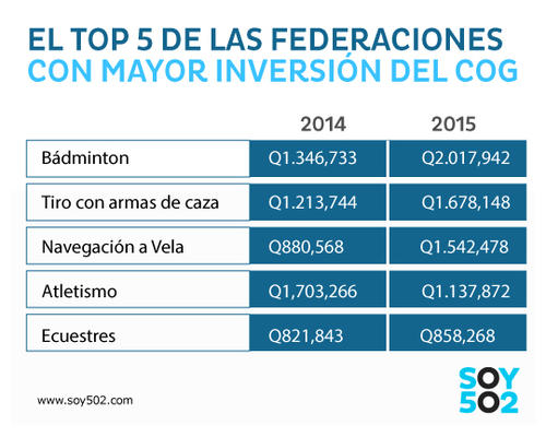 Igual que ocurre con el marchista Erick Barrondo, su federación deportiva, el atletismo, tampoco es la primera en asignación de recursos del COG, como lo muestra esta tabla con las cinco federaciones que concentran más recursos: