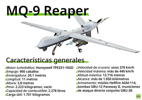 De acuerdo los datos de la Fuerza Aérea de EE.UU., el MQ-9 Reaper es un avión armado, de misiones múltiples, de altitud media y larga duración.