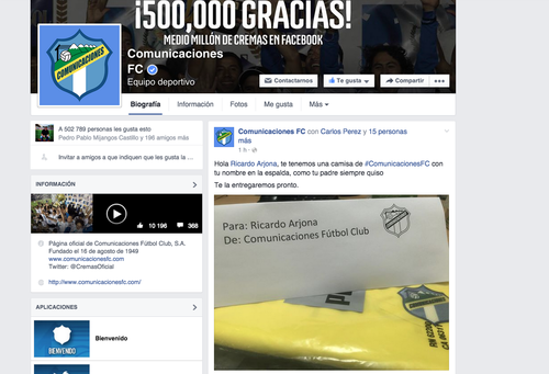 “Hola Ricardo Arjona, te tenemos una camisa de Comunicaciones FC con tu nombre en la espalda, como tu padre siempre quiso”, dice el post de los albos.