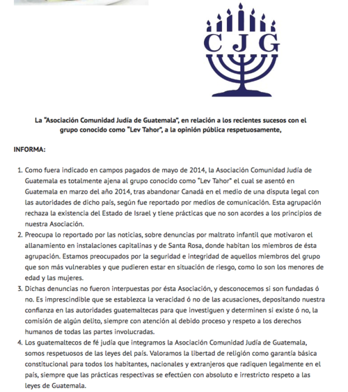 La Comunidad Judía de Guatemala emitió un pronunciamiento para desvincularse del grupo de judíos ortodoxos conocidos como Lev Tahor, derivado de los allanamientos de la última semana y señalamiento de supuesto maltrato infantil.