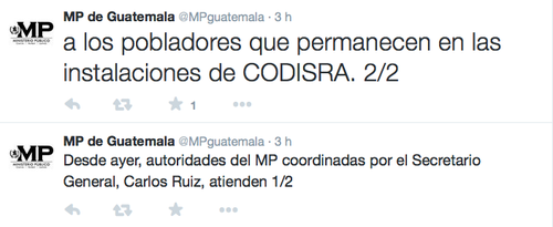 La acción de los comunitarios es una medida de presión para que las autoridades del Ministerio Público (MP) escuchen sus demandas y los atienda personalmente la Fiscal General, Thelma Aldana. Sin embargo, ningún representante del MP acudió al lugar, pese a que se había dado a conocer que acudiría el Secretario General de esa entidad, Carlos Ruiz.
