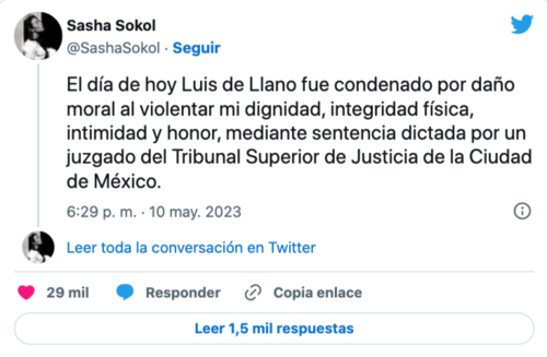 "El día de hoy Luis de Llano fue condenado por daño moral al violentar mi dignidad, integridad física, intimidad y honor, mediante sentencia dictada por un juzgado del Tribunal Superior de Justicia de la Ciudad de México", escribió en Twitter.