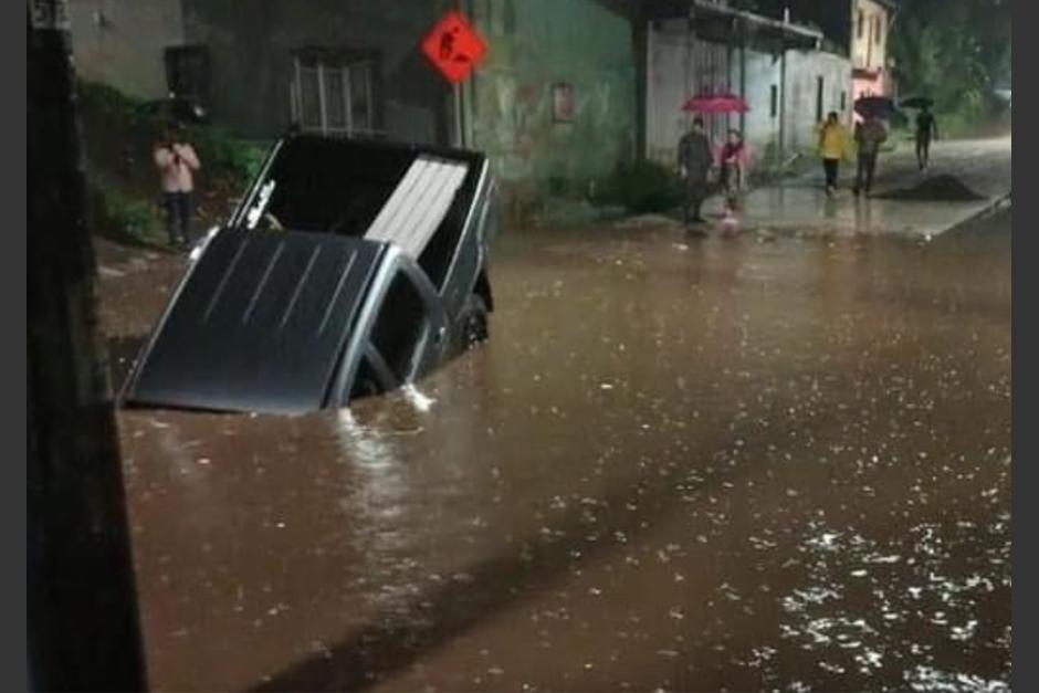 Picop cayó en hundimiento y quedo insertado, en la 8 calle de Palín, Escuintla. Tras inundaciones de la noche del jueves 20 de junio.@soy_502 pic.twitter.com/Loeu1gWV6H