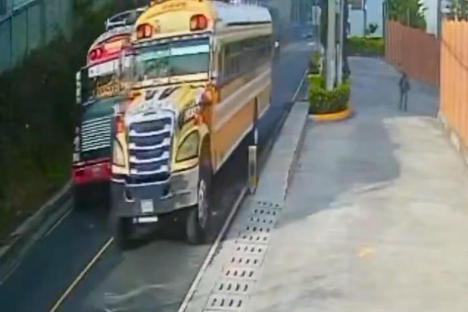 Los pasajeros de un camión repartidor de agua estuvieron cerca de ser víctimas de un accidente de tránsito luego que el conductor de un bus rebasara de forma imprudente a otra camioneta en Santa Catarina Pinula.