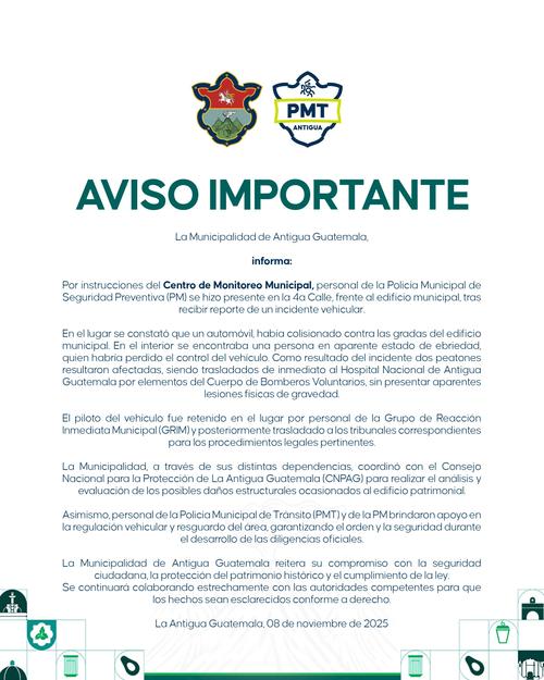 La Municipalidad de Antigua Guatemala informó que, por instrucciones del Centro de Monitoreo Municipal, personal de la Policía Municipal de Seguridad Preventiva (PM) se hizo presente la noche de este sábado 8 de noviembre en la 4a. calle, frente al edificio municipal, tras recibir reporte de un accidente.
