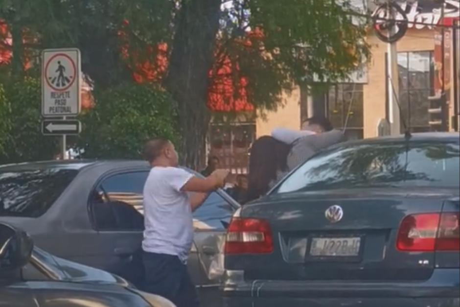El conductor de un vehículo fue captado cuando agredía a una mujer en medio del tránsito de la zona 9, el padre de la afectada intervino y también resultó golpeado.