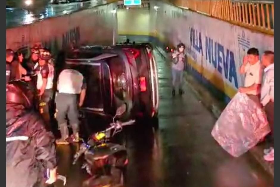 Las autoridades de tránsito informaron que el carro en el que viajaba la conductor quedó volcado en el paso a desnivel de Sonora, Linda Vista, kilómetro 19 ruta al Pacífico, con dirección al sur.