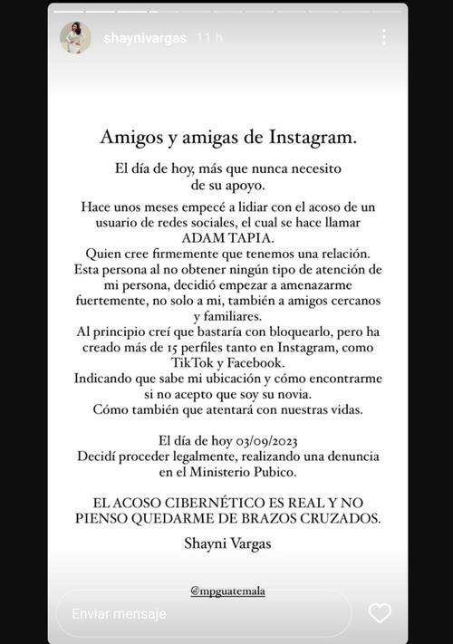 A través de sus historias en Instagram, la guatemalteca pidió apoyo a sus seguidores y reveló detalles de la la situación. "Amigos y amigas de Instagram. El día de hoy, más que nunca necesito de su apoyo. Hace unos meses empecé a lidiar con el acoso de un usuario de redes sociales, el cual se hace llamar Adam Tapia", expresó.