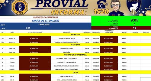 Según la Policía Municipal de Tránsito (PMT) de Guatemala, en la capital estos son los bloqueos que continúan: