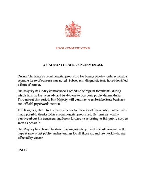 Este 5 de febrero, el Palacio de Buckingham confirmó, a través de un comunicado, que el Rey de Inglaterra, Carlos III, fue diagnosticado con cáncer.