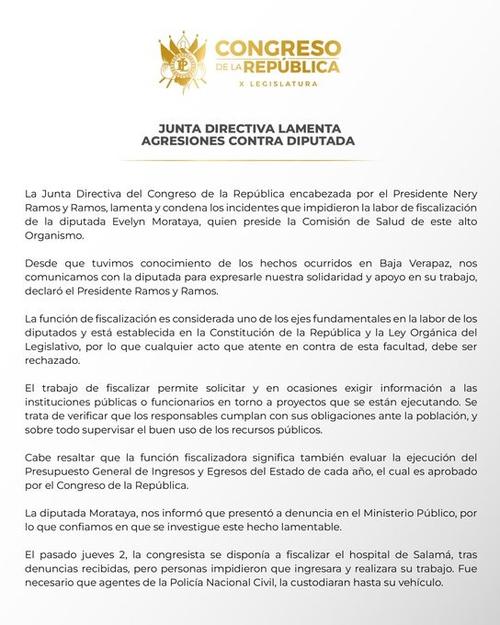 La Junta Directiva, en el comunicado, recuerda que la mencionada función es parte del trabajo de los legisladores y está respaldada por la Constitución Política de la República y la Ley Orgánica del Congreso.