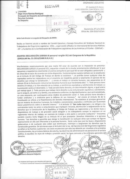 Los dos sindicatos más pequeños del Congreso, el STOL y el Sigecor, han tomado posturas similares. Los dirigentes del STOL le pidieron a sus afiliados no presentar las declaraciones por considerar que la Constitución Política de la República los ampara.