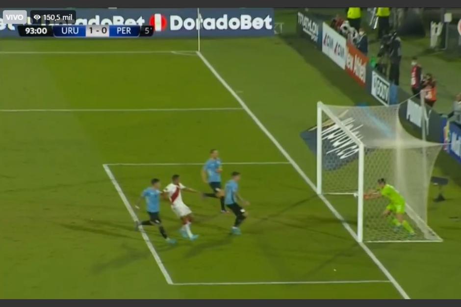 La pelota le quedó alta para el portero Uruguay, quien entró con todo y pelota a su arco. Sin embargo, el árbitro ignoró y no lo cobró.