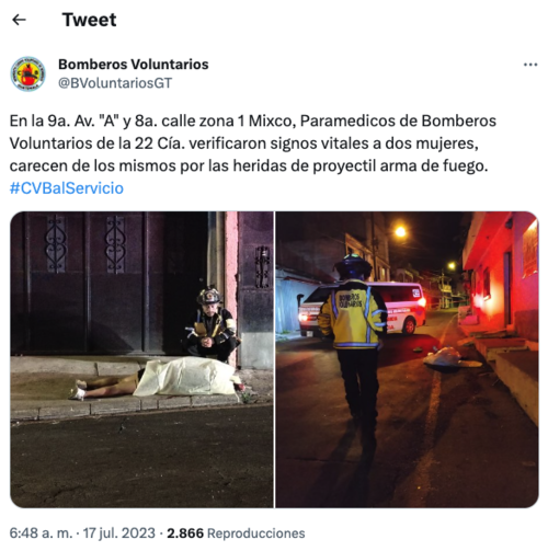 Durante la madrugada de este lunes 17 de julio, Bomberos Voluntarios reportaron el fallecimiento de dos mujeres, quienes fueron atacadas con arma de fuego en la zona 1 de Mixco.