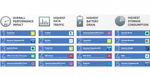 La app Snapchat encabeza la lista de las que herramientas que son iniciadas por el usuario. Tumblr está clasificada como la que más datos consume. Samsung WatchON es una de las apps que más batería necesita para funcionar y Spotity requiere de mayor espacio para almacenar datos.