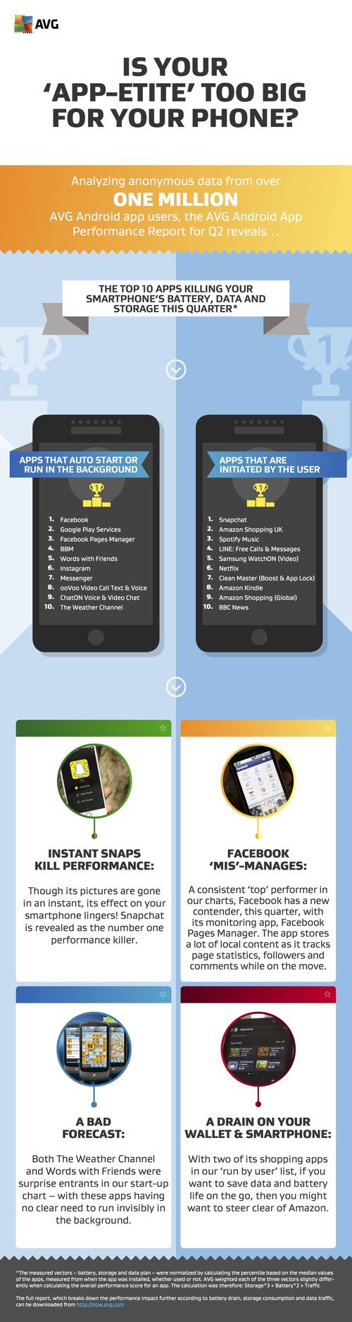 La empresa de seguridad AVG Antivirus ha publicado un listado que recopila el impacto que tienen varias aplicaciones en el rendimiento de los dispositivos con sistema operativo Android, el consumo de batería y el espacio de almacenamiento que ocupan.