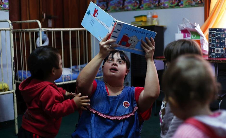 Los pequeños siguen con mucho interés el cuento que les narra Noelia Garella. Ninguno sabe que ante sí tiene a la primera persona con síndrome de Down que trabaja como maestra de preescolar en Argentina, y una de las pocas en el mundo.