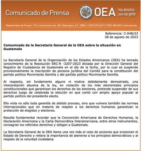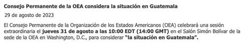 En su portal electrónico, la Organización publicó el llamado a esa junta, la cual se desarrollará el próximo jueves 31 de agosto, a las 12:00 horas. El único tema en el orden del día es "Considerar la situación en Guatemala".