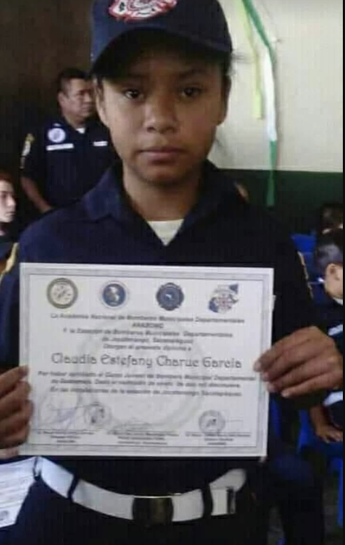 "Hoy fue llamada a la presencia del señor nuestra amiga, compañera, brigadista de la estación de bomberos municipales departamentales de Jocotenango Sacatepéquez, Claudia Estefany Charuc García. Hija de nuestro amigo y compañero Mario Martin Charuc".