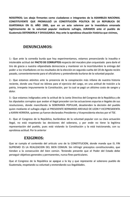 "Que estamos indignados ante la actitud de la Junta Directiva del Congreso y de los diputados corruptos que avalan el ilegal proceder con las actuaciones espurias e ilegales de sus resoluciones, donde mancillando la soberanía popular, desatienden la decisión del pueblo quien mediante el sufragio eligió al presidente Bernardo Arévalo de León y vicepresidenta a Karin Herrera quienes ya fueron declarados presidente y vicepresidenta electos por el TSE".
