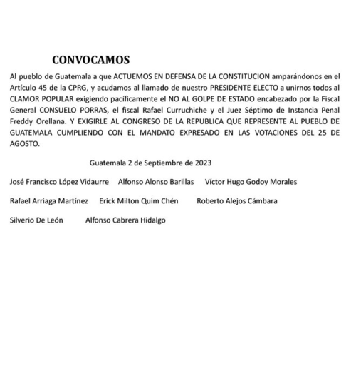 Así mismo, los constituyentes convocan a actuar en defensa de la Constitución y "actuar al llamado del presidente electo a unirnos todos al clamor popular exigiendo pacíficamente el 'no al golpe de Estado' encabezado por la Fiscal General Consuelo Porras, el Fiscal Rafael Curruchiche y el juez Séptimo de Instancia Penal, Fredy Orellana".