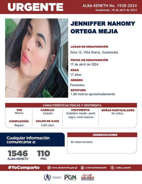 Continúa la búsqueda de Jenniffer Nahomy Ortega Mejía, una menor de 17 años que fue vista por última vez el 17 de abril.
