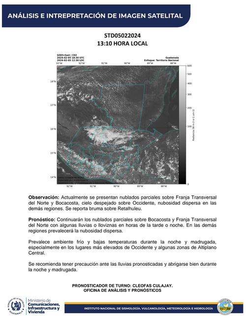 Para este lunes 5 de febrero, el Instituto Nacional de Sismología, Vulcanología, Meteorología e Hidrología (Insivumeh) informó que continuarán los nublados parciales sobre Bocacosta y Franja Transversal del Norte con posibles lluvias o lloviznas en horas de la tarde o noche.