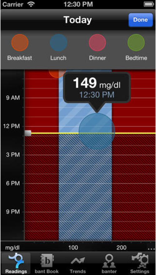 Fue desarrollada por el University Health Network de Toronto, Canadá. Bant app, que puedes obtenerla en español siempre y cuando este sea su idioma de preferencia en el iPhone, permite ingresar y analizar el nivel de azúcar que le arroje su glucómetro. Para hacerlo, solo falta apretar en el botón “Lecturas” y desde ahí registrar su medición, ya sea para desayuno, almuerzo, cena o merienda antes de dormir. Desde el botón “Tendencias” puede analizar sus niveles de glucosa, comida por comida, para los últimos 7, 14, 21 o 90 días. Y si usted es fanático de las redes sociales, puede compartir su información por Twitter, desde el botón “Comunidad”.