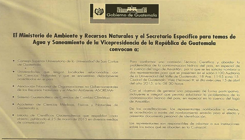 La convocatoria se realiza “con el objetivo de generar una propuesta de forma participativa, incluyente e integral que permita solucionar la problemática de la contaminación hídrica del país, en especial en la Cuenca del Lago de Amatitlán“.