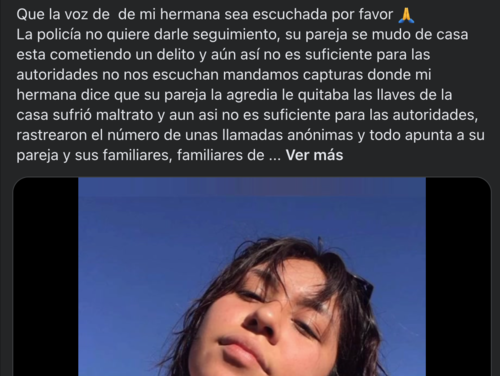 "Que la voz de de mi hermana sea escuchada por favor. La policía no quiere darle seguimiento, su pareja se mudo de casa esta cometiendo un delito y aún así no es suficiente para las autoridades no nos escuchan. Mandamos capturas donde mi hermana dice que su pareja la agredía, le quitaba las llaves de la casa, sufrió maltrato y aun así no es suficiente para las autoridades", aseguró la hermana de la desaparecida.