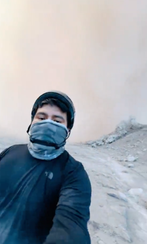 "En la cima, una fuerte erupción nos sacó, nunca he visto una erupción tan fuerte en este volcán hasta ahora, es muy peligroso estar aquí, es un ascenso prohibido, vean cómo viene el humo", inició en un adelanto en Tik Tok.