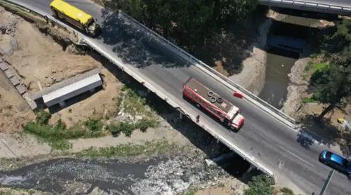 Abajo del puente, que se ubica en el kilómetro 12.5 de la ruta al Pacífico, pasa el cause de un río, el cual crece en invierno y daña aún más las bases del puente.