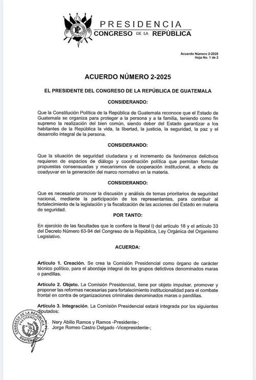 Su principal función será "impulsar, promover y proponer las reformas necesarias para fortalecimiento institucionalidad para el combate frontal en contra de organizaciones criminales denominados maras o pandillas", reza el acuerdo.