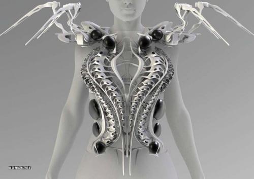 La estructura en sí misma fue modelada utilizando uno de los módulos Edison de Intel y está equipada con sensores de movimiento y de respiración conectados a un procesador instalado en la espalda.