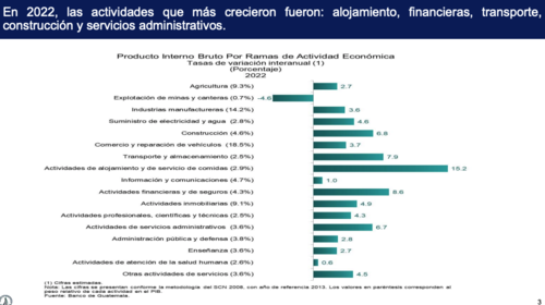Según el Banguat, las actividades de alojamiento (hoteles) y servicio de comida (restaurantes) fueron los puntos que más influyeron en el crecimiento económico. Según datos del Banco Central, durante el 2022 registraron un aumento del 15.2%; además, las actividades financieras y de seguros tuvieron una subida del 8.6%, seguida de la actividad de transporte y almacenamiento con un 7.9%.