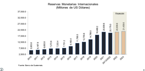 Las autoridades del Banguat y Giammattei hablaron de las reservas monetarias internacionales, las cuales cierran este 2022 con un crecimiento del 3.6% y se prevé que el otro año sea de tan solo 2.3%. Este indicador permite a las calificadoras internacionales establecer la solidez económica en los países.