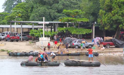 Las aguas del río Suchiate han soportado toneladas de productos y personas que cruzan de Guatemala a México y viceversa. balsas hechizas fabricadas con palets de madera y dos tubos de llanta de tractor son el principal medio de transporte para transitar entre Centro y Norteamérica.