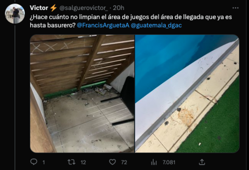 "Da pena venir a recibir a nuestra gente al aeropuerto... ¿Cómo es posible mantener esta área TAN sucia?", publicó el usuario Victor Salguero en su cuenta de la red social de Twitter.