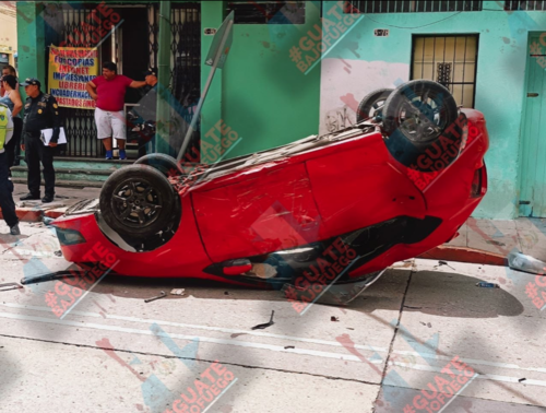Al momento que transitaba, impactó con el otro carro que venía por la vía perpendicular. El automóvil rojo dio vueltas y quedó volcado. El incidente se registró en la esquina de la 4ta. Calle y 5ta. Avenida de la zona 1 capitalina.