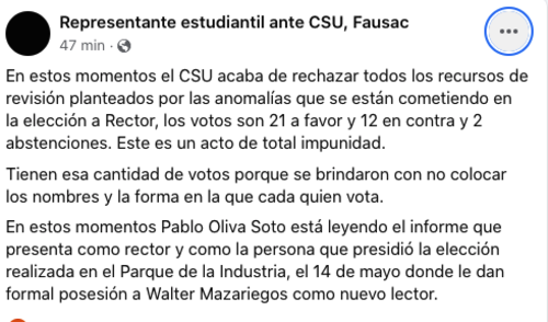 Eduardo Villalta, representante de la Facultad de Agronomía ante el Consejo Superior Universitario, denunció que fueron 21 votos a favor, 12 en contra y 2 abstenciones de avalar la elección de Mazariegos.