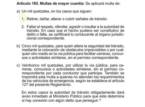 Montejo explicó a Soy502 que inicialmente la multa por derribar una señal de tránsito puede ser de Q1 mil tal como se establece en el Artículo 185, inciso A, número 1 del Reglamento de Tránsito.