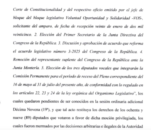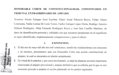 El amparo que fue presentado busca retirar la inmunidad de Mulet, por presuntamente haber cometido el delito de obstrucción a la justicia. Además, que se ordene a la Corte Suprema de Justicia (CSJ) que emita una resolución "debidamente fundamentada", debido a que el 27 de abril esta instancia rechazó la solicitud del MP a una primera solicitud de antejuicio por este mismo caso.