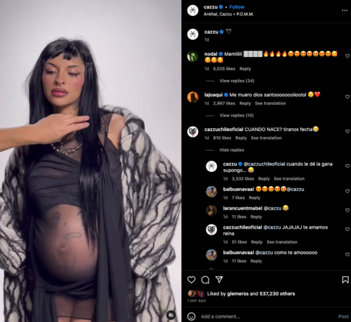 Ante esto, la cuenta "Cazzuchileofocial" le comentó a la famosa "¿Cuándo nace? Tíranos fecha", a lo que ella respondió "Cuando le dé la gana supongo".