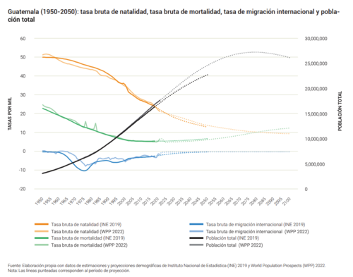 Cabe destacar que Guatemala se encuentra atravesando la tercera fase de la transición demográfica, que se caracteriza por el descenso de la natalidad y mortalidad, que tiene como resultado un ritmo más lento de crecimiento natural. Este fenómeno provocaría a largo plazo un aumento de las personas mayores y sus demandas en materia previsional, de salud pública y cuidados.