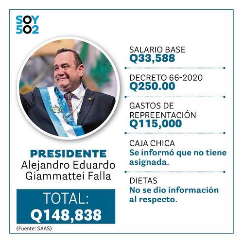 En el caso de Alejandro Giammattei, su salario mensual es de Q148,838.00, por lo que al finalizar su mandato habrá recibido Q7.1 millones (Q7,144,224.00)