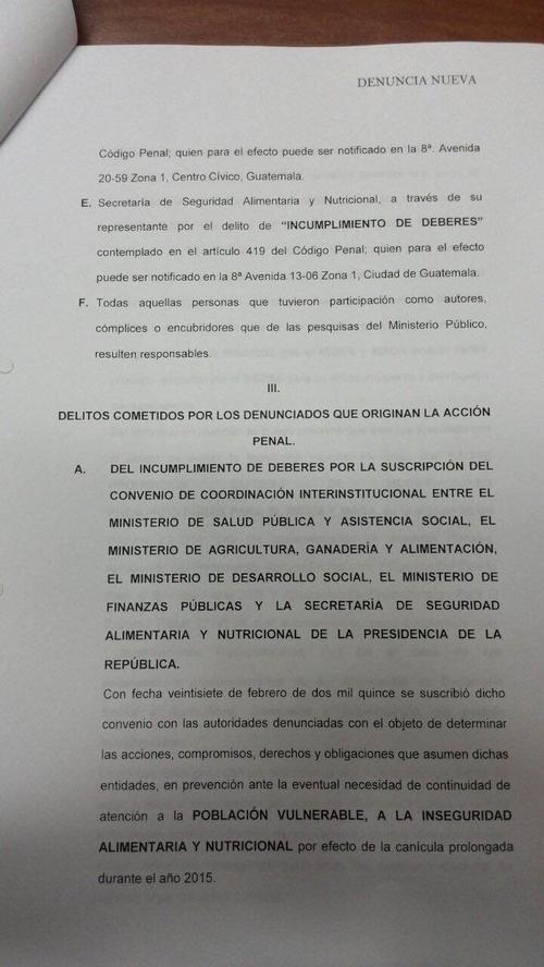 Cuatro ministerios y una secretaría fueron denunciados por incumplimiento de deberes y fraude, ya que se desconoce el destino de 238 millones de quetzales de un total de 700 millones de quetzales, que fueron operados para ser utilizados en beneficio de las personas afectadas por la canícula prolongada del año pasado.