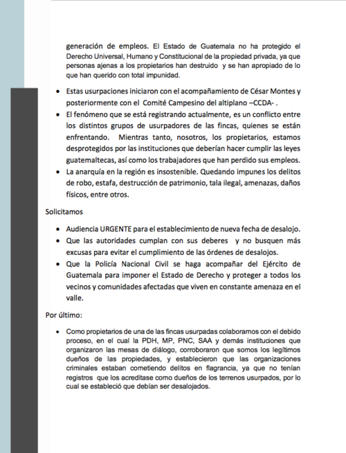 En el documento reiteran que se trata de la usurpación de cuatro fincas en el valle, siendo: