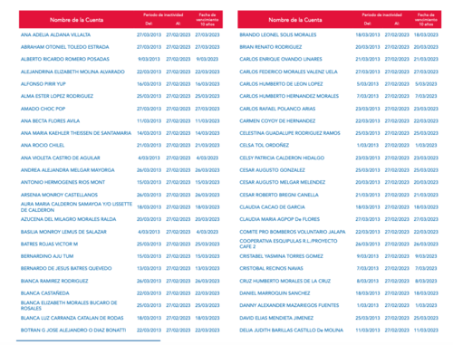 En total, son 243 cuentas de ahorro y monetarias las que están por ser clausuradas por contener saldos menores a Q1 mil o US$125, que han permanecido inactivas durante los últimos diez años en dicha entidad y otorga un plazo de 30 días hábiles para que los cuenta habientes se presenten para reactivarlas. Para evitar el cierre, es necesario que el cuentahabiente realice alguna transacción, ya sea un retiro o un depósito con el fin de reactivar su cuenta.
