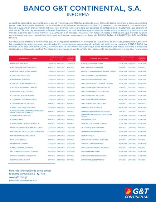 La entidad bancaria hace la publicación para que las personas propietarias de estas cuentas monetarias o de ahorro puedan acercarse y evitar que los montos sean enviados al Fopa. Este es el mensaje compartido en el Diario Oficial:
