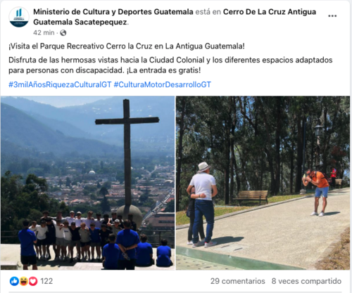 "¡Visita el Parque Recreativo Cerro la Cruz en La Antigua Guatemala! Disfruta de las hermosas vistas hacia la Ciudad Colonial y los diferentes espacios adaptados para personas con discapacidad. ¡La entrada es gratis!", se lee en el mensaje.